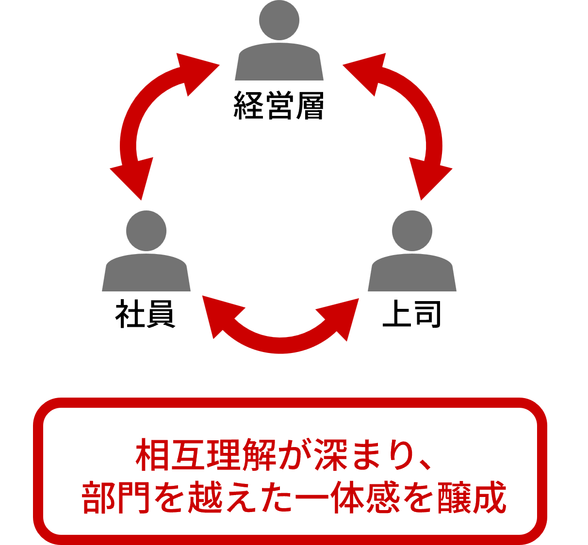 さらに、マネジメント層と社員といった役職の垣根を越えたコミュニケーションも活発化しており、組織の一体感醸成につながっています。