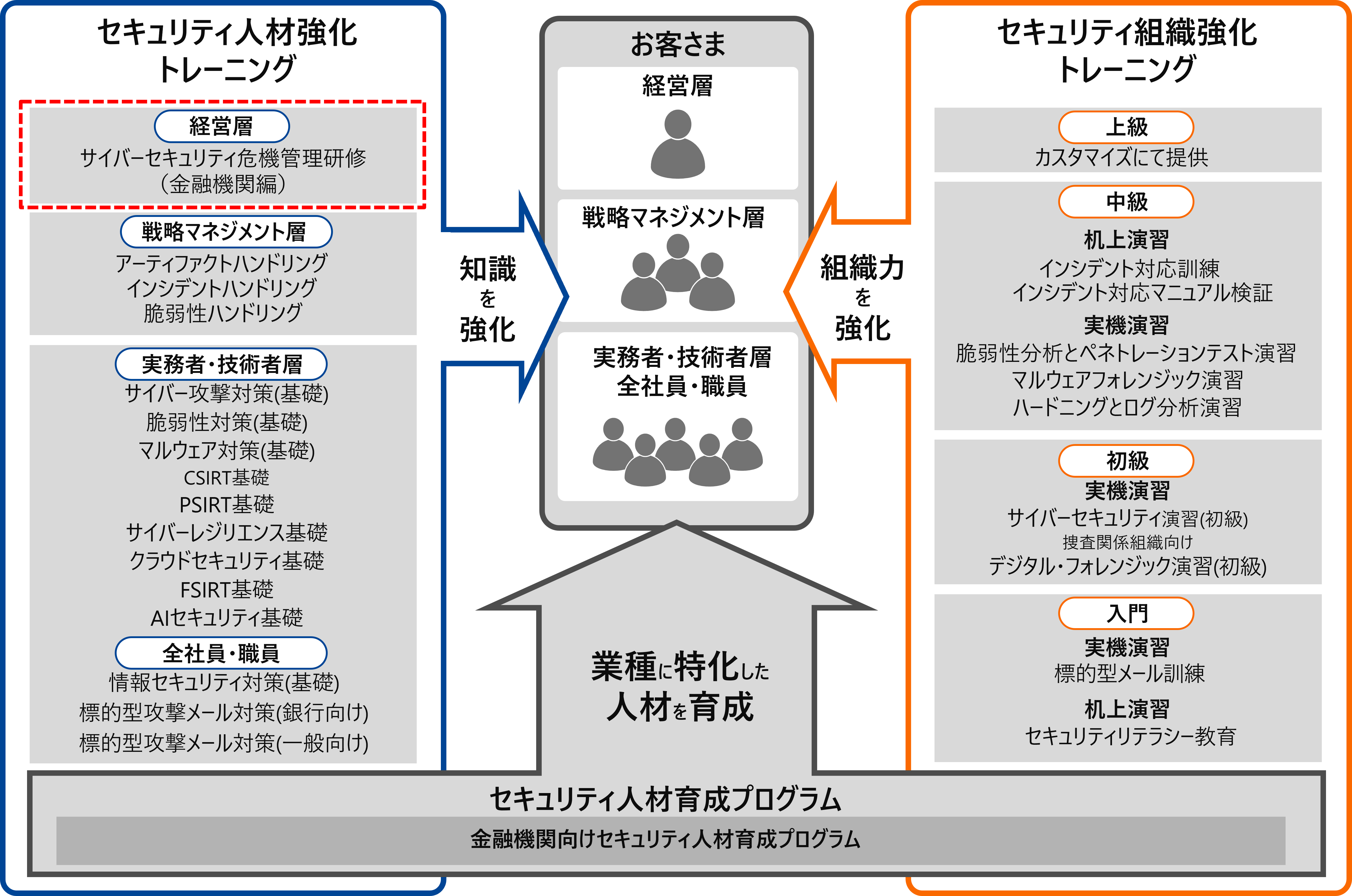 本研修は特に、金融機関の経営層の皆さまを対象としたヒアリングを通じて得られた「経営層に求められる実践的なサイバーセキュリティ対応力」に関する意見や要望を反映し、構成しています。こうしたヒアリングの中で得た、今求められている実用的な内容を提供することで、脅威を増すサイバー攻撃に対抗します。