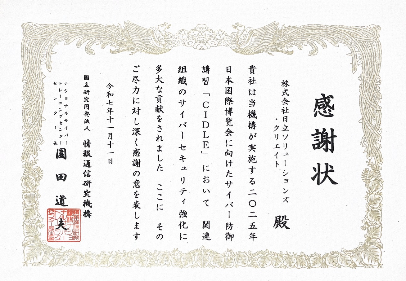 この取り組みが、万博の安全を守ることに大きく貢献したと評価され、このたび、国立研究開発法人情報通信研究機構(以下、NICT)から感謝状を授与されました。
